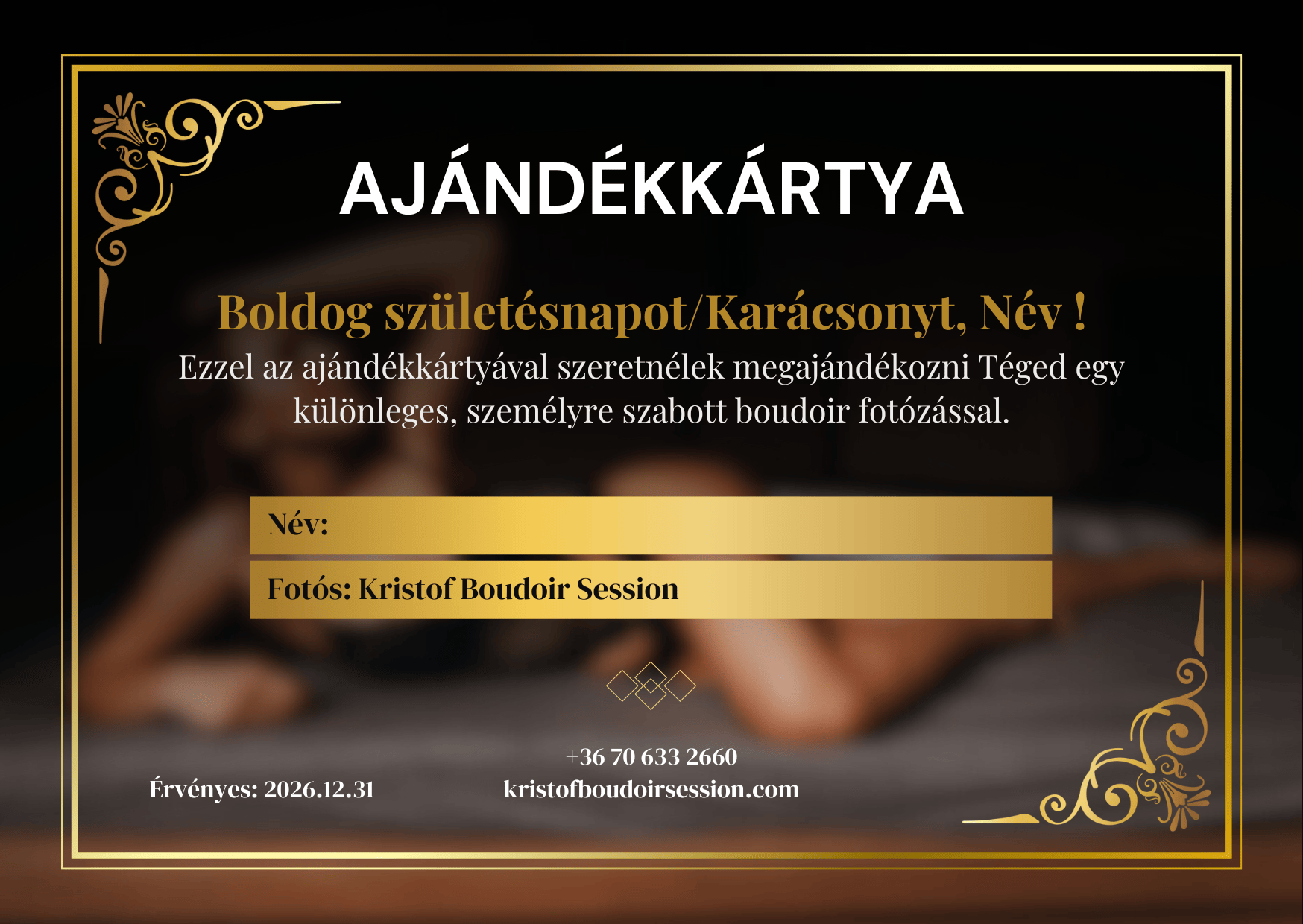 Az ajándékkártya minimum a Boudoir Élmény csomagra szól (75.000 Ft-tól), amely tartalmazza:
